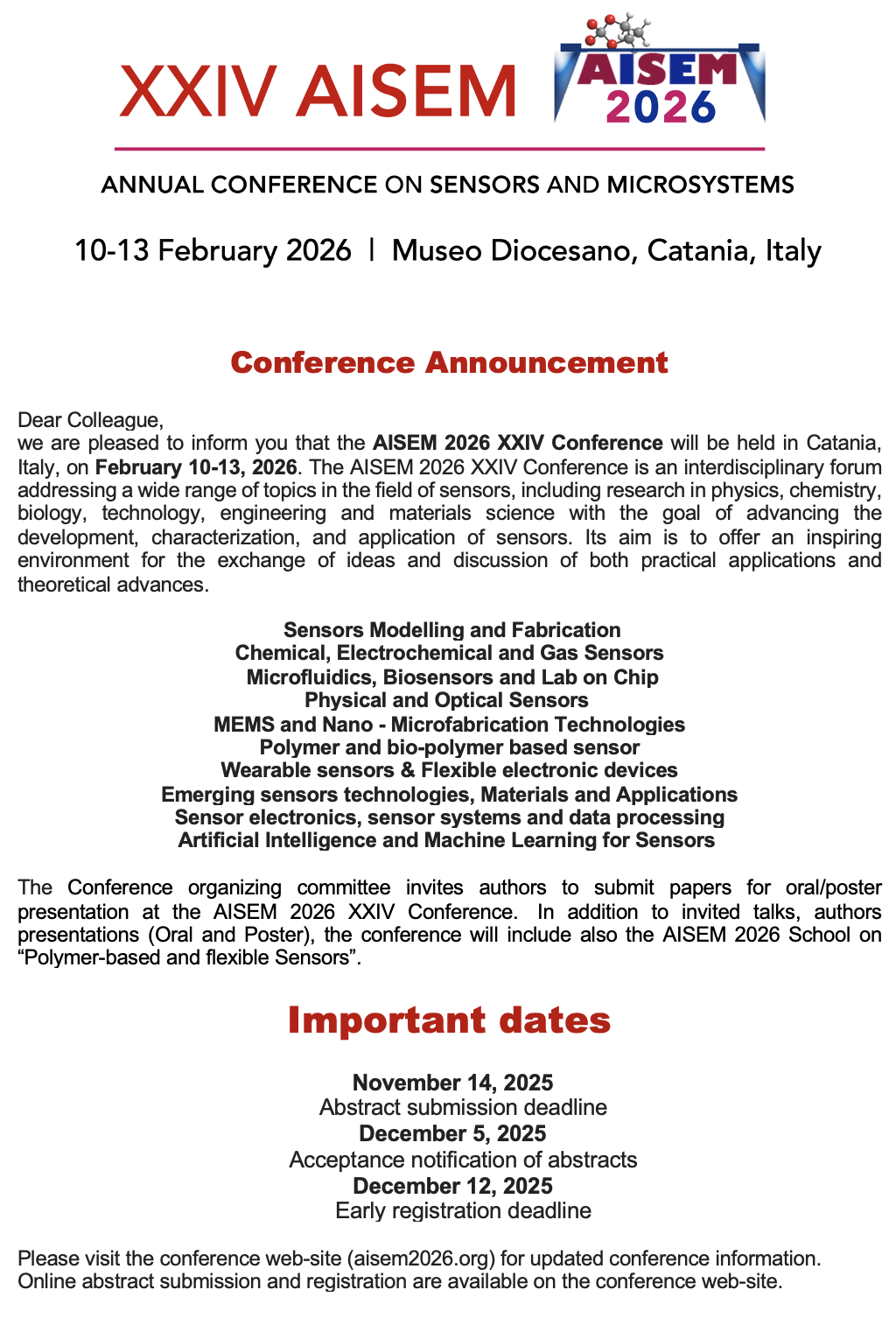 The AISEM 2026 XXIV Conference is an interdisciplinary forum addressing a wide range of topics in the field of sensors, including research in physics, chemistry, biology, technology, engineering and materials science with the aim of providing an ideal environment for researchers and innovators to discuss practical and theoretical work covering on: